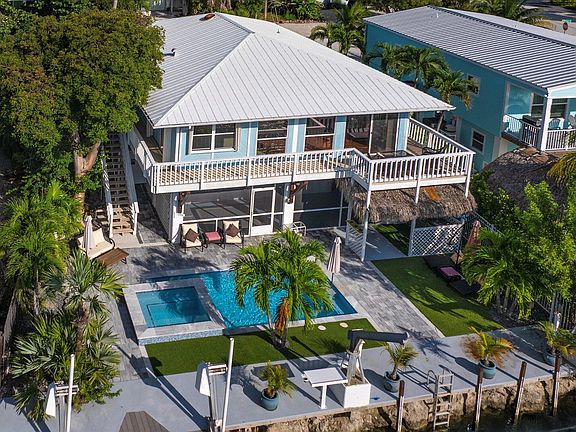 Experience the best of island living at this beautifully updated Cudjoe Key retreat with quick ocean access. Built in 1990 and extensively renovated in 2020 this stilted coastal home blends modern comfort with timeless Keys style.The 1,400 sq ft interior features a bright open layout, custom kitchen, and spa-inspired bathrooms.Outside enjoy a resort-style saltwater pool with both heater and chiller surrounded by lush tropical landscaping. Boaters will love the 10,000 lb lift, concrete dock and direct access to open water. The ground level includes an enclosed 4-car garage, storage and workshop. Relax or entertain in the screened tiki lounge with built-in BBQ and outdoor shower. Metal roof (2018) and active insurance policies ensure peace of mind. Perfect as a primary residence, vacation home or investment property, Turnkey island escape ready to enjoy. Walk to Square Grouper & My New Joint! 7 restaurants within 3 miles for your dining pleasure. Easy to show--schedule your private tour today.