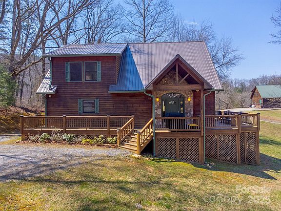 This modern rustic cabin boasts long-range mountain views. Enjoy the expansive deck, complete with a hot tub and fire pit, all situated on a gently sloping yard perfect for relaxation and fun. The home's design blends with nature, featuring a wall of windows that fills the space with natural light as you enter. Cozy up by the stone fireplace on chilly mornings while soaking in the picturesque surroundings. The owner's suite is conveniently located on the main floor, offering a spacious bedroom and a luxurious bathroom. Upstairs, you'll discover 2 generously sized bedrooms and a versatile loft area, ideal for an office or reading nook. Situated near the Tuckasegee River, Western Carolina University and Cherokee, this cabin provides access to fishing, mountain biking, and more. Being sold substantially furnished with tasteful modern decor, this property has also been a successful part-time vacation rental, making it a perfect investment opportunity, vacation home or full time residence.