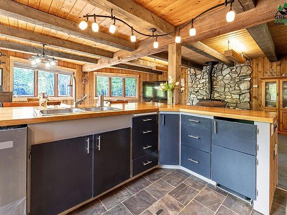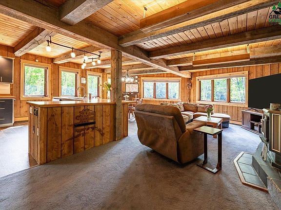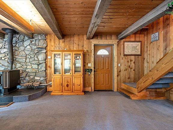 Welcome to your dream Alaskan retreat, where rustic charm meets modern living. Nestled on 1.8 tranquil acres on the west side of Fairbanks, this stunning 5-bedroom, 3-bathroom home offers the perfect blend of comfort and style. Step onto the expansive wrap-around deck and into the welcoming main entrance, where you'll find an open-concept living room, dining area, and kitchen bathed in natural light from large surrounding windows. The kitchen is a chef's delight, featuring ample counter space and a brand-new dishwasher. This floor also includes two spacious bedrooms and a full bathroom, with convenient access to the garage via an interior stairway. Upstairs, discover two additional bedrooms and a large bathroom with a jetted tub under a picturesque window and a walk-in shower. Down the hall, the primary bedroom awaits, boasting a generous walk-in closet and large windows that fill the room with light. The lower level garage houses a utility room with a stackable washer/dryer setup, another full bathroom, and an additional bedroom—perfect for guests or a home office. The expansive deck is perfect for entertaining. It has views over the RV pad and firepit area, making it ideal for outdoor gatherings. This smart home has a Ring alarm system and Alexa features for convenience and security. The current owner enjoys the benefits of Starlink internet service, ensuring you stay connected even in this serene location. Take advantage of the opportunity to own this unique blend of rustic elegance and modern amenities in beautiful Fairbanks!