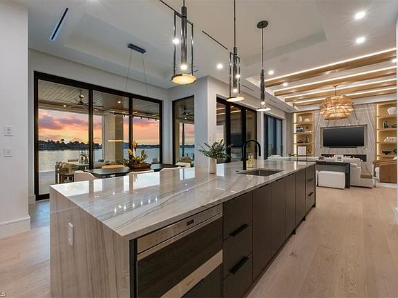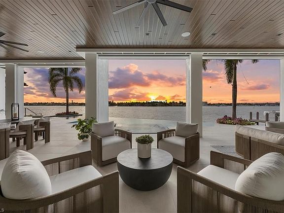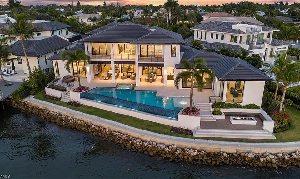 Step into the pinnacle of luxury waterfront living with this one-of-a-kind masterpiece, built to the newest base flood elevation code. Crafted by the acclaimed team of C&E Builders and renowned designer Ruta Menaghlazi of Theory Design. This stunning 6,500 square-foot custom estate is a testament to visionary design and unparalleled craftsmanship. Every inch of this home exudes sophistication and elegance, offering breathtaking panoramic water views that greet you the moment you step inside. As you enter, you are welcomed by an expansive living room bathed in natural light, with floor-to-ceiling windows framing sweeping vistas of the bay. This space is perfect for entertaining, where indoor-outdoor living is effortless, and every sunset becomes an event to be savored. Seamless flow leads you to the outdoor oasis, where a sun shelf, a custom spa, and a sparkling pool beckon you to soak up the western exposure sun or relax under the stars. The heart of this residence is the chef’s kitchen—a true showpiece with luxurious quartzite countertops. The oversized center island invites both grand celebrations and casual gatherings, while top-tier appliances await the culinary enthusiast. Tucked away, a tastefully concealed butler’s pantry offers generous prep and storage space, ensuring effortless entertaining. The primary suite on the main level is a serene sanctuary, designed for ultimate relaxation. Its spa-like en-suite bath boasts elegant finishes, a soaking tub, and an oversized shower with multiple showerheads, delivering a resort-like experience right at home. Upstairs, via your private elevator, you'll discover a versatile loft and morning kitchen, perfect for guests to enjoy their own slice of paradise. Each guest bedroom is ensuite, offering balconies with mesmerizing water views. Entertainment knows no bounds here, with a first-floor club room that has it all, including a luxury billiards table, a custom bar and a movie theatre-style TV sitting area. Attached to the club room is a fifth ensuite bedroom that could also be used as a study or workout room. For boating enthusiasts, the home's 157 feet of water frontage provides direct, bridge-free access to the Gulf of Mexico, making it a boater’s dream come true. This estate places you just minutes from the world-class shopping, dining, and pristine beaches of 5th Avenue South. This is more than a home—it’s an experience, a statement, and the epitome of Naples living.