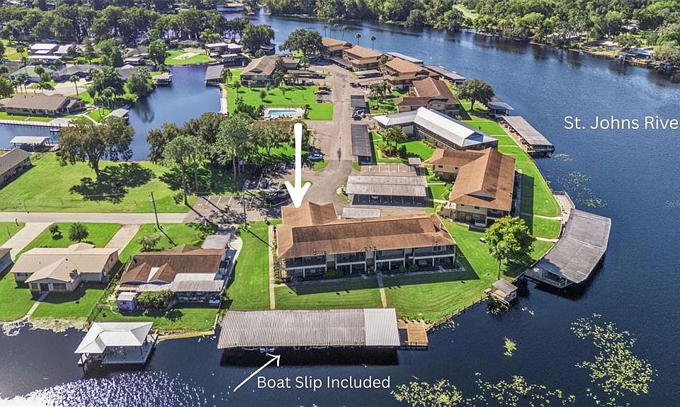 Seller Motivated-NEW PRICE! Welcome to Jungle Den, a peaceful riverfront community along the St. Johns River offering scenic walkways, a community pool, clubhouse, shared fishing pier, and beautifully maintained grounds. Just 30–45 minutes from the beaches of Daytona, Ormond, and New Smyrna, and minutes from Blue Creek boat ramp, this location offers a perfect balance of nature, recreation, and accessibility. This second-floor, fully updated 2-bedroom, 1-bathroom condo includes exclusive use of a private dock, complete with a covered boat slip ideal for boating to nearby restaurants, fishing, or a day trip to Silver Glen. A fish cleaning station is conveniently located on site. Inside, the condo features luxury vinyl flooring, a fully renovated kitchen and bathroom, updated bedrooms, and BRAND NEW HVAC, NEW ENERGY EFFICIENT WINDOWS and a NEW SLIDER DOOR that fills the space with natural light. Breathe easy in this quiet setting surrounded by wildlife and river views. Whether you're seeking a full time residence, peaceful retreat, or investment property, this condo checks every box. The HOA allows rentals with a ONE MONTH MINIMUM RENTAL , providing great potential for seasonal or long term rental income.
