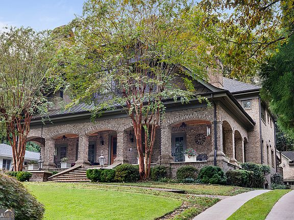 Tucked away in the heart of Atlanta's Sherwood Forest neighborhood, this custom-built estate is a masterclass in architectural detail and refined living. Thoughtfully designed with layered materials and timeless finishes, the home blends old-world craftsmanship with modern innovation. A wide, deep covered front porch with tongue and groove ceiling, gas lights, and ceiling fans spans the front of the home-creating a gracious welcome and an ideal space for year-round enjoyment. Inside, generous open rooms flow seamlessly, designed for both relaxed living and entertaining. Both the formal dining room and the fireside office/library open directly onto the covered front porch through sets of French doors, enhancing the home's indoor-outdoor connection and providing an exceptional entertaining flow. Custom leaded-glass doors close off the library for quieter moments by the cozy fireplace. A dramatic two-story foyer with an imported Italian tiled ceiling and Turkish terracotta flooring sets the tone for the home's timeless details. Seven fireplaces-each capped with custom stone and brickwork that mirrors the banister finials-anchor the home with warmth and artistry. Beamed ceilings, hardwood floors, and finely crafted millwork add depth throughout. The main kitchen is outfitted for serious culinary work, featuring dual refrigerators, dual dishwashers, a butler's pantry, three sinks, and bespoke cabinetry. A second full kitchen on the terrace level adds versatility for hosting or multi-generational living. The main level also features a secondary primary bedroom suite-ideal for guests or those seeking one-level living. Upstairs, the primary suite is a true retreat, with vaulted ceilings, an oversized walk-in closet with space for a private office or dressing lounge, and a beautifully tiled bath with fireplace-creating a serene and luxurious atmosphere. Also on the lower level: a 1,000+ bottle wine cellar with tasting room, a fireside entertaining lounge featuring a generous fireplace and a stunning original bar-meticulously reassembled on-site after being imported from Europe-a fitness suite with separate laundry and a river stone steam room that fits eight, an office, and flexible space for media or games. The fully updated Control4 system provides intercom, security, and whole-home sound through an integrated speaker system. An elevator serves all levels. Outdoors, a brick loggia with a built-in pizza oven and gas grill overlooks the private, gated backyard and pool-perfect for entertaining or unwinding in total privacy. A whole-house generator provides comfort and peace of mind throughout the seasons.