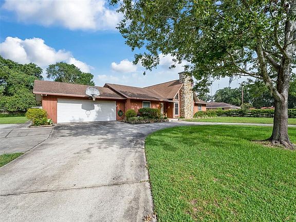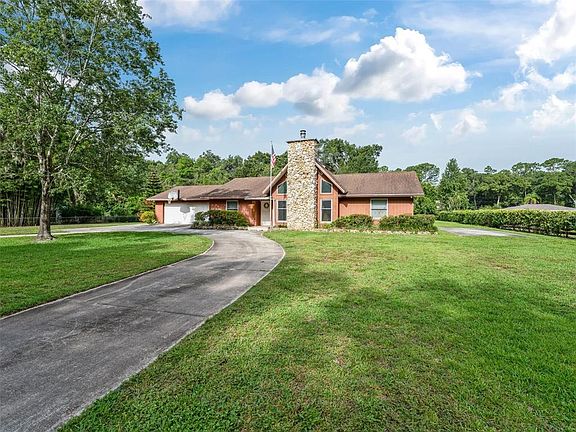 As you approach this home, you will find a large circular drive that will lead you to this beautiful 3 bedroom, 2 bath home situated on over a acre lot. Take note of the gable roof with a stunning exterior stone chimney, which is the focal point of this home. As you enter this home through the foyer you will be in awe as you enter the spacious living area with natural light through the large decorative windows. The amazing fireplace, surrounded by stone from floor to ceiling is the highlight of this room. Imagine sitting by the fireplace while enjoying quiet time with a nice cup of hot coffee. The decorative ceiling beams with luxury vinyl flooring add to this wonderful interior design. The spacious dining area boasts of vaulted ceilings with decorative ceiling beams and custom windows. Lets talk about this gorgeous kitchen, which was remolded 8 months ago. The kitchen boasts of wood cabinetry with crown molding on the upper cabinets and large pull-out drawers with soft close. The large island with drop in glass top Induction range and island range hood is the main feature of this kitchen. The granite counters, stainless sink with upgraded faucets, and stainless Bosch appliances complete this kitchen. This kitchen is a chefs delight! The master bedroom features an ensuite bath. There are two additional guest bedrooms and an indoor laundry area. The guest bathroom shower was just remodeled and has its own hot water heater. As you exit to the rear of the home, you will find a screened lanai with tile flooring. This is a great area to entertain guests or just sit quietly admiring the outdoors. There is an oversized garage 25x21, an 18x18 workshop with electric and a 12x16 shed with a loft. A 14x36 concrete pad is ready for your RV. There is also a screened building which is a great area to place your grill and cook up some amazing barbeque. Call today and make this your next home!