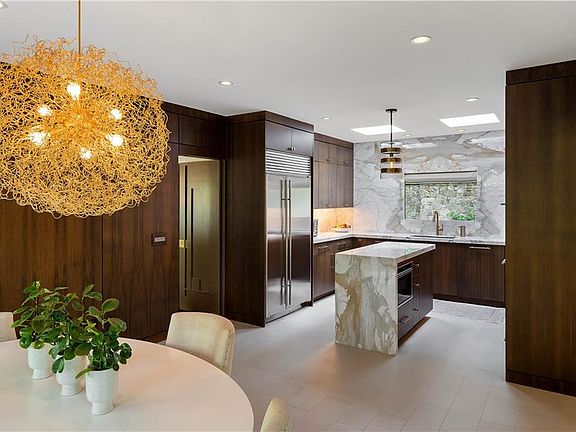 Sinatra-meets-modern-chic vibeSleek modern sensibilityStriking outdoor fireplaceTreetop-level deckSeparate office spaceWalls of floor-to-ceiling glassTranquil escape