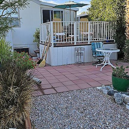 Here is a 2008 Park Model in Sands RV and Golf Resort near Palm Springs, CA. This is a perfect location for quiet and active retirement or snowbird desert living. A full length additional room ads twice the living space and possibly of a second bedroom. A large deck looks over your own desert flower garden with drip system and mountain views. This park model has a full sized stove, refrigerator, washer and dryer. The carport along the entire length of the home gives shaded parking for 2 cars. A short walk takes you to the resort's clubhouse for the pool area, gymn, recreation area, pickleball courts, and 9 hole golf course. This extra large lot and use of all of these amenities is available to you for only $680 per month.