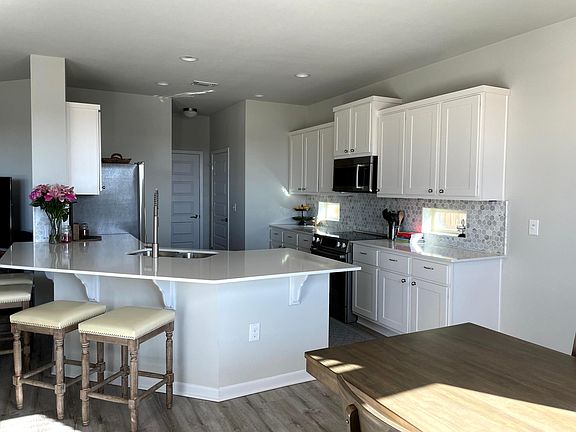 Downstairs: Stainless steel kitchen with large island and plenty of cupboard and pantry space. Two car garage with electric charging plug. Laundry room with shelves. Half bath. Open, spacious living and dining area.