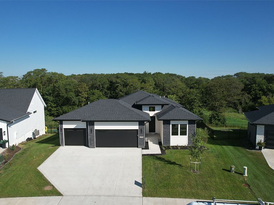 Experience luxury living with Embarq Signature Homes’ stunning Hoffman plan—an architectural masterpiece nestled on a spacious 0.35-acre walkout lot backing to peaceful, wooded views. This home offers the perfect blend of privacy, elegance, and functionality. Step inside to soaring ceilings and a bright, open-concept layout filled with natural light. The great room’s expansive windows create a warm, inviting atmosphere, while the chef’s kitchen impresses with tall custom cabinetry, a massive island ideal for entertaining, a walk-in pantry that exceeds expectations, and top-tier Café appliances. The mudroom is thoughtfully designed with built-in storage, a bench, and coat hooks for everyday convenience. Retreat to the beautiful primary suite featuring a tray ceiling, a spa-like bathroom with double vanity and custom tiled shower, and a spacious walk-in closet. The finished walkout lower level includes a sleek wet bar with full-size French door refrigerator and dishwasher, plus a dedicated theater room perfect for movie nights or game day gatherings. Step outside to a large patio and enjoy the tranquility of your wooded retreat. With generous storage and a prime location near Waukee schools, parks, and trails, this home truly checks every box.