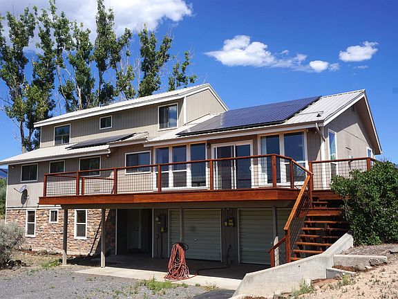 Just two minutes west of Cedaredge, a beautiful house on a secluded irrigated acreage! The spacious home features a main floor master suite, a huge kitchen with a nifty pantry, and a light-filled dining room walking out to an expansive deck, plus wonderful views of Grand Mesa, the West Elks and the San Juans. The second floor has two bedrooms and a full bath. The bright garden level is accessible from the main floor and has its own ground-level entrance; it hosts a self-contained apartment with another bedroom, bath, full kitchen, large living room, laundry closet with washer/dryer, storage/work rooms and a separate ground-level entrance. Grid-connected solar panels and extensive southern exposure help heating bills stay low, and a system employing a large hidden fan and internal upstairs bedroom windows keeps air circulating throughout the house. The 28 acres, largely in irrigated pasture, slope gently to the south and the parcel is partially edged by mature shade trees. Waterproof footwear is recommended for those wishing to walk in the pastures. High-speed fiber optic internet is supplied by Elevate. Please see Seller's Notes in Associated Docs for information re: heating, irrigation system, etc.