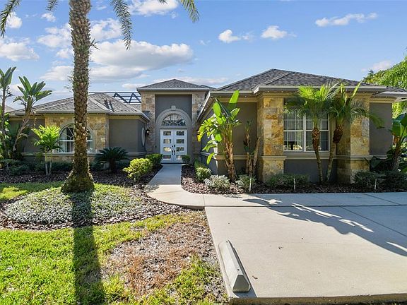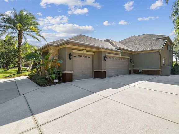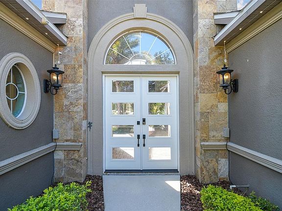 Welcome to this custom built home sitting on a gorgeous half acre lakefront lot. This home features a power entry gate, 5 full bedrooms assures that everyone will have their own private oasis overlooking either the pool or the lake, and each room will have it's own balcony or patio. There is also a separate in-law suite perfect for aging parents or teenagers wanting their own space, in law suite is poolside. From the minute you enter the pool courtyard through the front door you will be amazed at everything this home has to offer. The living room with its gorgeous built ins, and fireplace, kitchen, and dining room all have stunning views of the pool. Kitchen features newer appliances, gas/propane stove, granite countertops with an island and two sinks not to mention a raised bar. Kitchen also features a large walk in pantry. The separate open dining area leads to the huge family/entertainment room with soaring 18 foot ceilings. The entertainment room features lots of windows with fantastic views of the lake. You'll also have a built in fireplace with an elevator tv that doubles as a security monitor. On another wall you'll have a hidden power projector screen for a short-throw projector, giving you spectacular movie nights at home. The unique shaped office-studio with high ceiling will give you plenty of controlled outside lighting with the built in window shutters and views of the pool/courtyard/front door. the primary suite has high, coffered ceiling, two walk in closets, travertine throughout with built in cabinetry. The huge screened enclosed back/lake patio gives you spectacular views of the large backyard and lake. Pet friendly with a fenced side yard. Plenty of room on the patio for a portable firepit to enjoy the stunning sunsets over the lake. The second story offers 3 bedrooms, two have their own balcony, on full bathroom and all new carpeting in 2025. Oversized three car garage with durable flooring, insulated attic storage 2 transfer boxes for back up power hook up. Garage is also wired for charging to EVs. Lawn sprinklers on a well. All 3 hvac units replaced in 2017/2018, Pool remodeled and resurfaced in 2023, New roof in 2021, water heater replaced in 2020. Tall 8 foot doors throughout.