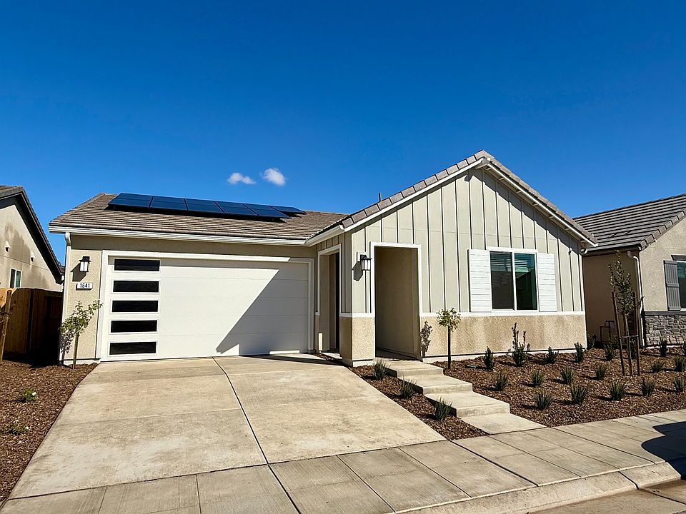 The primary suite is privately situated at the back of the home and includes dual sinks and a large step-in shower. Additional highlights include wood-look tile flooring in main areas, cozy carpet in bedrooms, and solar panels to help lower energy costs. Surrounded by other single-story homes for extra privacy, this home is ideally located near The Row and soon-to-open The Avenue shopping centers, offering top dining and retail options all within the award-winning Clovis Unified School District.