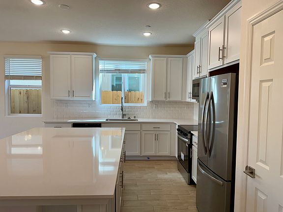 Enjoy an open-concept layout with a spacious living and dining area that flows seamlessly into a beautifully appointed kitchen showcasing a large quartz island, white shaker cabinets, and stainless steel appliances perfect for entertaining or everyday living. The home includes a refrigerator, washer, and dryer (without warranty) for added convenience.