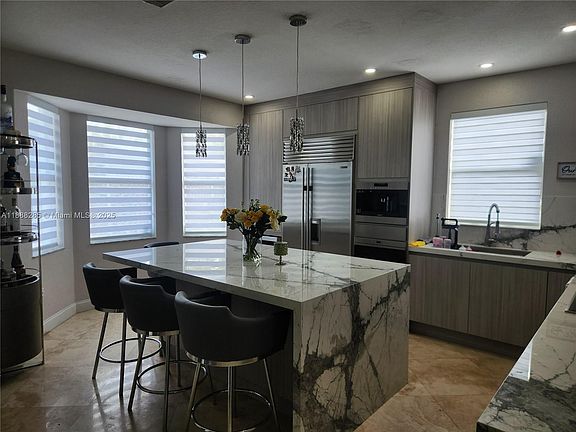 Fully remodeled corner home, 5/3 with spacious bedrooms, travertine marble floor, a beautiful staircase, high ceilings that let in natural light and give a modern touch to the house. The kitchen is spectacular, with Italian cabinetry, a quartz island, high-end appliances. One bedroom and a full bathroom downstairs for your convenience. Saltwater pool and space for your big boat, kitchen, BBQ in the backyard for your social gatherings, super cozy backyard, spacious two-car garage, and plenty of parking space around the house. Great schools and good neighborhood, this property is a great investment!