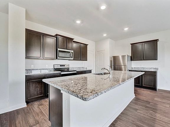 Walk in to a foyer that connects to the living room, half bath, closet, garage entry, and kitchen. The kitchen includes all appliances, a large island with breakfast bar, a walk-in pantry, and a dining area.