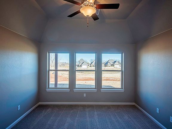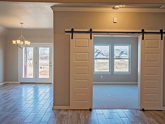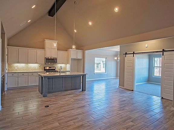 Located in the boutique community of Monarch Ridge. This beautiful home has a grand entry perfect for your favorite artwork or family photos. The huge open living,living,dining is the perfect place to host family or friends year round. The kitchen features a very large island, glass-front cabinets, quartz counter tops, and under cabinet lighting. The living space and kitchen feature a vaulted ceiling with a massive stained beam. The flex room is located right off of the main living space behind a pair of barn doors. This space is the perfect size for secondary living, a playroom, or a study. Spacious master suite is separate from the over sized secondary bedrooms. The master bath includes extra long 6' soaker tub, plenty of counter space on the double vanity, and a large master closet. Located on a home site that has no one backing up to you and also near the well fed pond, this home has a full sprinkler system, security system, and HERS rated for low utility bills.