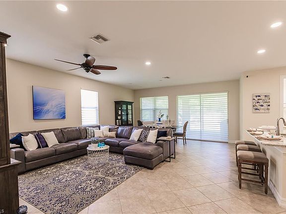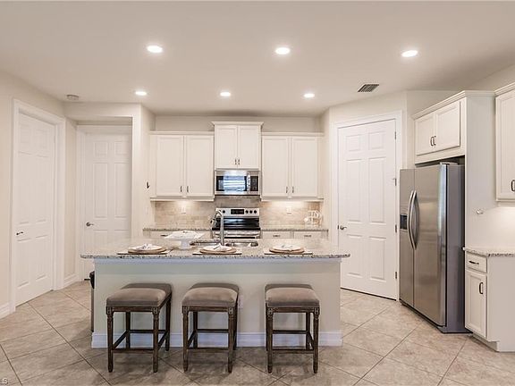 Welcome to Barrington Cove! This beautifully maintained 3-bedroom, 2-bath home, built in 2017, combines modern elegance with inviting warmth. Featuring an open floor plan, high ceilings, and a spacious kitchen with granite counters, white cabinets, and stainless steel appliances, it’s perfect for both daily living and entertaining. Every room is enhanced with high-end Hunter Douglas window treatments, adding a touch of luxury throughout. The primary suite offers dual walk-in closets, a walk-in shower, and double vanities. Outside, enjoy a private screened lanai with brick pavers and lush landscaping. The garage is equipped with epoxy flooring and additional storage. Located in a top-rated school district, this North Naples gem is part of a community with low maintenance fees and offers easy access to Mercato, Seed to Table, and Naples’ stunning beaches.