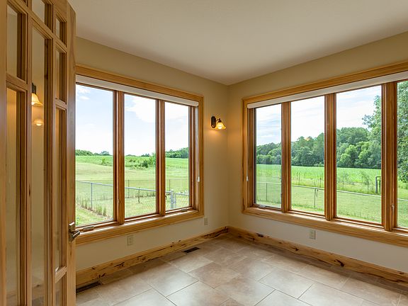 Stunning rambler nestled on 2 acres. This custom 2,900-square-foot home is top-of-the-line in all aspects including custom woodwork by Doors of Distinction, walnut floors, rustic hickory doors, in-floor heat, energy-efficient technology & a large maint-free deck. The bright, open floor plan on the main-level features a spacious LR w/beautiful stone fplc. Modern kit, sunroom w/views. Lg FR, 3BR, a den that could be a 4th BR, new carpet, Superior Wall foundation & more! This home is absolutely stunning. Plenty of room for a pole shed.