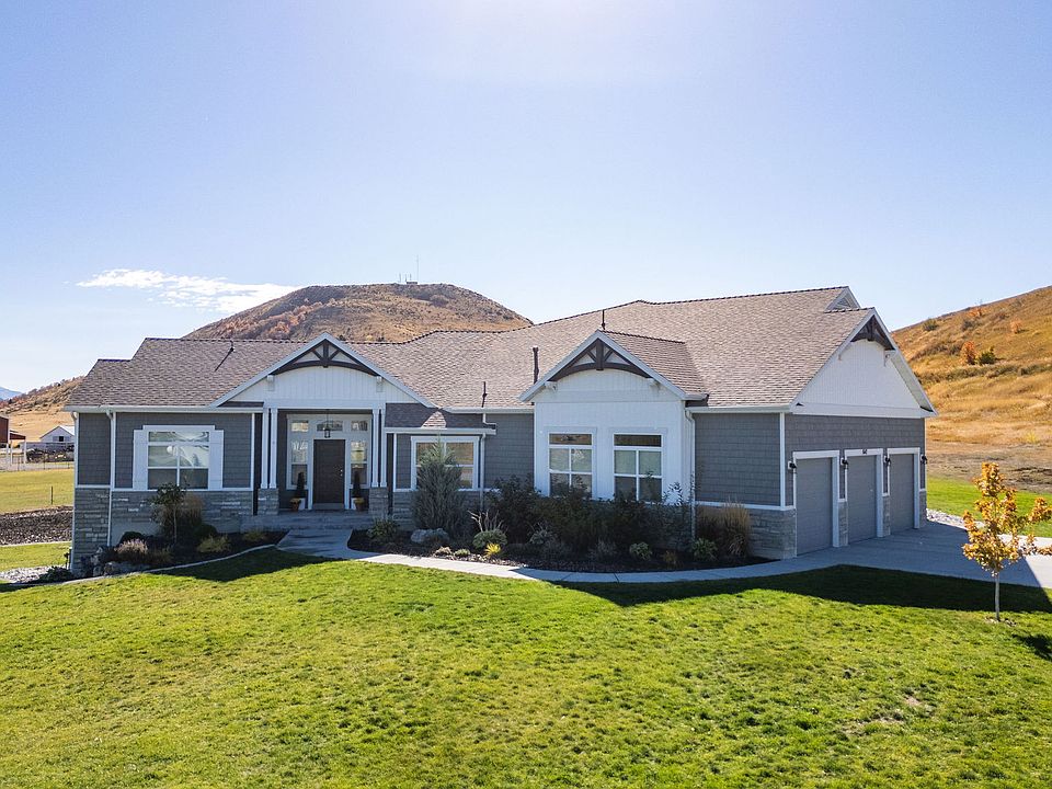 Exceptional, luxury property. Built in 2019, this fully finished home has 5,154 square feet and 6 bedrooms on 1.87 flat, usable acres. Enjoy beautiful, modern finishes, soaring 12' ceilings throughout and impressive curb appeal that is illuminated by stunning outdoor lighting. The large, open designer kitchen features abundant white cabinets, double ovens, subway tile, island and a large walk-in pantry with butler's counter. The spacious, main level primary suite features a spa-like bathroom with a doorless walk-in shower and a large walk-in closet with a skylight. The stunning view overlooking Cache Valley from the deck invites you to sit and enjoy some quiet time. The main level offers two additional bedrooms, while the lower level features three more, including a home gym in the sixth bedroom, a spacious casual living room with an adjoining game area, and a ground-level walkout to a shaded patio. The full sprinkler system is connected to pressurized secondary irrigation water and animals are welcome. Buyer to verify all information.