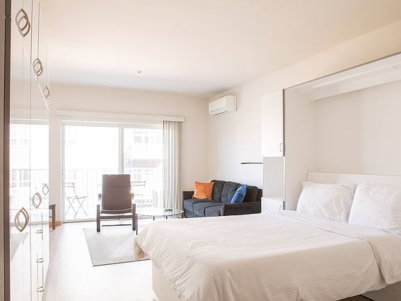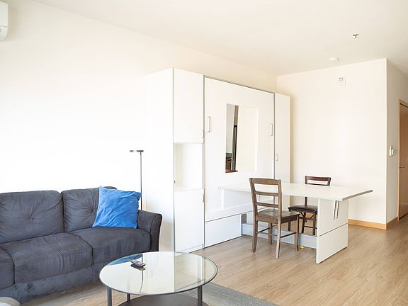 The space comfortably sleeps two with a queen size Murphy bed that doubles as a work/dining table. The living room sofa may serve as an additional sleeping area, however please note it does not have a pull-out bed.