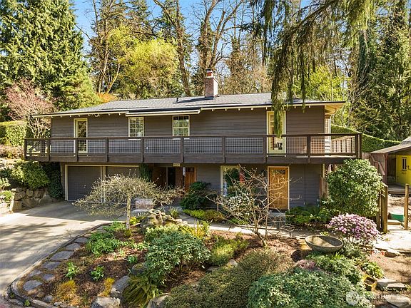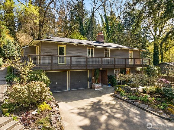 Tucked away on a quiet, private lot, this peaceful Kenmore home blends natural serenity with modern comfort. Surrounded by a lush greenbelt it’s a true Northwest sanctuary—complete with a wraparound deck perfect for relaxing, entertaining, or soaking in territorial views. Inside, enjoy an inviting living space with custom woodwork and a large primary bedroom with option for home office. Flexible layout includes remodeled lower level w/separate entry, guest bedroom, and two car garage. Detached bonus art studio! Highly desirable Northshore School District. Quiet neighborhood with quick access to downtown Kenmore, St Edward State Park, Inglewood golf course and commuter routes. Brand new roof w/lifetime warranty, and brand new septic system!