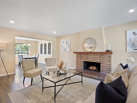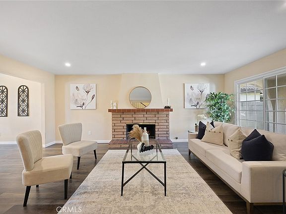 Offered for sale is this beautifully updated 5 bedroom, 3 bath cul-de-sac home in this highly desirable Cerritos neighborhood. As you walk through the front door, past the cozy front porch, you'll immediately notice the rich luxury vinyl flooring, freshly painted walls, fireplace and large windows allowing a bounty of natural light to enter the large space. Continue through the spacious dining area to the newly remodeled kitchen that features new cabinets, quartz countertops, new stove, and stainless-steel microwave and dishwasher.  Enjoy meals or breakfast coffee on the large peninsula counter overlooking the cozy family room fireplace. The home features a large downstairs bedroom that can be used as a playroom, office or simply a downstairs bedroom.  Just up the stairs are the remaining four spacious bedrooms including a large master bedroom featuring a walk-in closet and beautifully remodeled master bathroom shower and vanity area.  Enjoy the back yard that features two patio covers and plenty of hardscape and grassy area for those special celebrations or everyday enjoyment. Additional home features include central air and heat, 2-car garage, 2 fireplaces, and a beautiful large entryway.  This home is close to parks, schools (including award winning Whitney High School), dining shopping and 91, 5 and 605 Freeways.