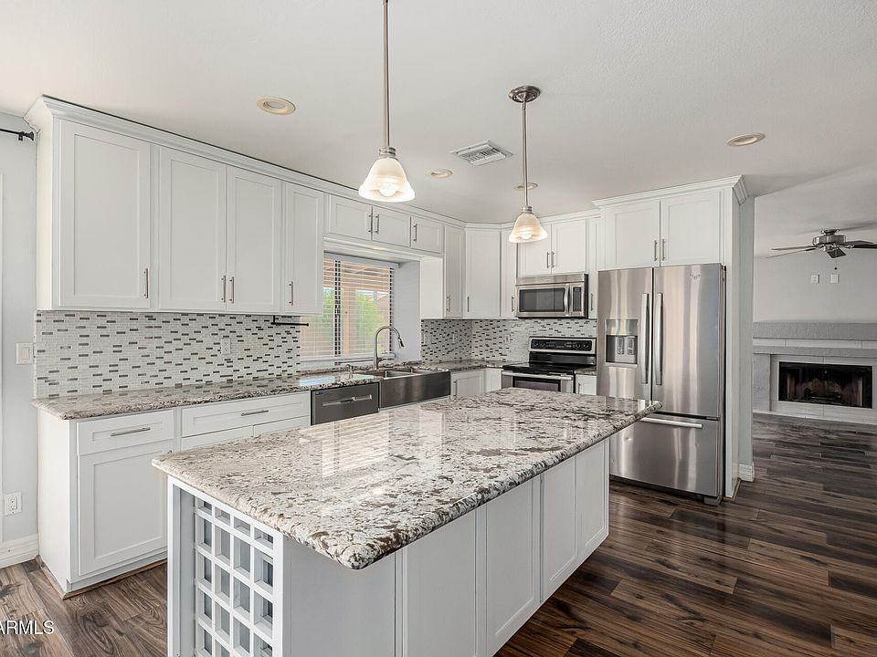 Welcome to your dream 2-story retreat! Inside, vaulted ceilings and wood-look floors set the tone for stylish comfort, while the living room greets you with warmth. Cozy up by the fireplace in the family room, or whip up gourmet meals in the kitchen featuring stainless steel appliances, granite counters, crisp white cabinetry, a mosaic tile backsplash, and a center island with a breakfast bar perfect for morning chats. Primary suite is a true haven with a walk-in closet and spa-like bath complete with dual sinks, a soaking tub, and a glass-enclosed shower. Plantation shutters add elegance to the secondary bedrooms. And when it's time to relax? Head out back to the covered patio or take a dip in your very own sparkling pool. Why just imagine it when you can live it? Act now!