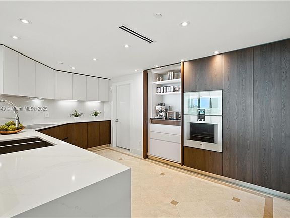 Old World Charm Meets Modern Luxury. Welcome to prestigious Santa Maria, where timeless elegance blends with contemporary living. 2,100 sq ft of refined interiors, featuring expansive living spaces & a wraparound balcony with breathtaking sunset & city views. Recently remodeled unit with sleek Mia Cucina cabinetry & top-of-the-line Gaggenau appliances. 2 bedrooms, 2.5 bathrooms, and a separate laundry room with service entrance for convenience. Features include travertine flooring throughout the living areas & wide plank oak floors in the bdrm. Floor-to-ceiling windows offer stunning vistas from every room. Residents enjoy world-class amenities. Such as gym, a children’s play area, Pilates room, community room, concierge, valet and soon to be completed resort like pool & tennis courts.