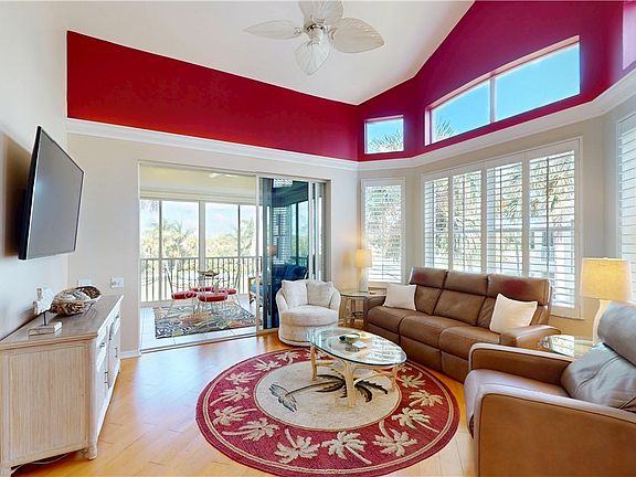 This beautifully maintained and fully furnished/turnkey top floor 2 bedroom 2 bath “Sheffield” condo is PRICED TO SELL! It is located in the Lexington Country Club’s Golf Village (bundled golf) just minutes from Sanibel and Ft Myers Beach. This tastefully appointed end unit condo is the largest of the condos and backs to hole 14. Enjoy the screened lanai with acrylic sliders overlooking the beautiful view of the preserves and the fairway and pond. It is so private! The condo has high ceilings and is flooded with natural light. All windows have plantation shutters and hurricane shutters. The kitchen has been updated with new countertops and undercounter lighting. Primary bathroom has a frameless shower enclosure and new mirrors and lighting. Living room, dining room, and 2 bedrooms have light hardwood floors. A designated covered parking spot is just outside the entry.