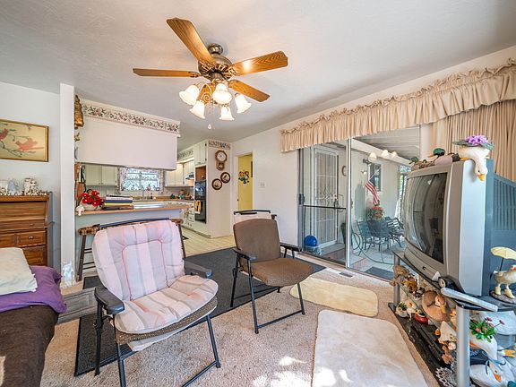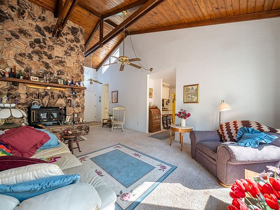 Inside, the inviting living room features vaulted, beamed ceilings and a cozy wood stove, creating a warm and rustic atmosphere. The floor plan also includes an indoor laundry room and thoughtful updates like a newer roof and HVAC system for added peace of mind.