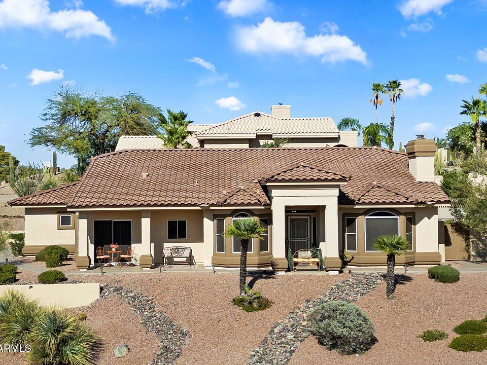 Experience breathtaking McDowell Mountain views from this elevated, one-third-acre lot. This inviting, well-maintained home features 3 bedrooms & 2.5 baths, w/ tile flooring throughout for a cohesive, inviting feel. The spacious living room centers around a stone fireplace. The kitchen boasts granite counters & a sunny breakfast room, while the formal dining area is perfect for special occasions. The primary suite is privately tucked away for restful retreat. Ample storage is found throughout the home & in the oversized two-car garage w/additional built-ins. Step outside to a backyard designed for both relaxation & entertaining. Enjoy the sparkling pool w/ plenty of surrounding patio space for lounge chairs or al fresco dining, all framed by panoramic mountain vistas. Brand new roof 2025