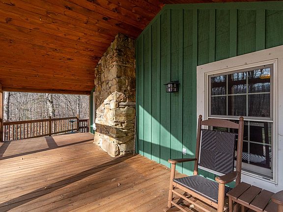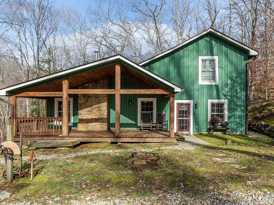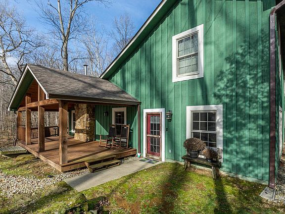 Tranquility abounds in this very private, well-maintained home perched on a ridge overlooking 3-plus wooded acres, a short drive from Bloomington and Indiana University. Originally built in 1965, this updated 3-bedroom, 3-bath home over a finished walk-out basement is located in the storied arts enclave of Nashville, IN. It offers an authentic cabin aesthetic with all the conveniences and modern comforts of an energy-aware home. Crossing the threshold, family and guests will know they can unwind here. The main level has beautiful wide-plank pine wood floors and ample wood-trimmed windows that showcase the property's stunning views. A large living/family room with a wood burning stove features new 3-panel sliding glass doors that stretch the length of the room and lead to the deck. The updated kitchen features maple cabinets that complement the red oak counter tops, new stainless steel appliances and sink, and an island with storage that opens to the large dining area. The remodeled master suite on the main level has double closets, floor-to-ceiling windows, a stunning stone shower, double vanity and a laundry area. Two additional bedrooms and a full bath are located on the upper level. The lower level offers a second large gathering space accented by a stone wall and wood-burning fireplace, and a third bathroom. The home's outdoor entertainment spaces include a covered porch that wraps around the home, wide decks, a patio off the basement, and a very large screened-in porch off the kitchen. The home is wired for fiber optic internet and features an environmentally friendly geothermal HVAC system that minimizes both the home's carbon footprint and electricity demand. In addition, a hard-wired dehumidifier and a new ecobee© Wi-Fi-enabled thermostat contribute both to comfort and energy efficiency. The home features an attached shed, a small fenced yard, two wells and a low-maintenance Presby septic system. Just minutes from downtown Nashville, this wooded hideaway offers a welcome respite from a hectic life.