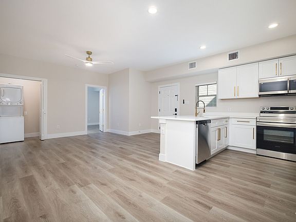 Gas stoveContemporary cabinetryFresh paintUpdated fixturesUpdated bathroomHigh ceilingsVinyl plank flooring