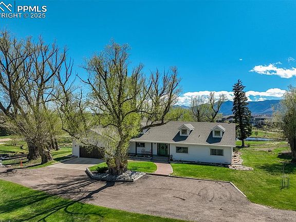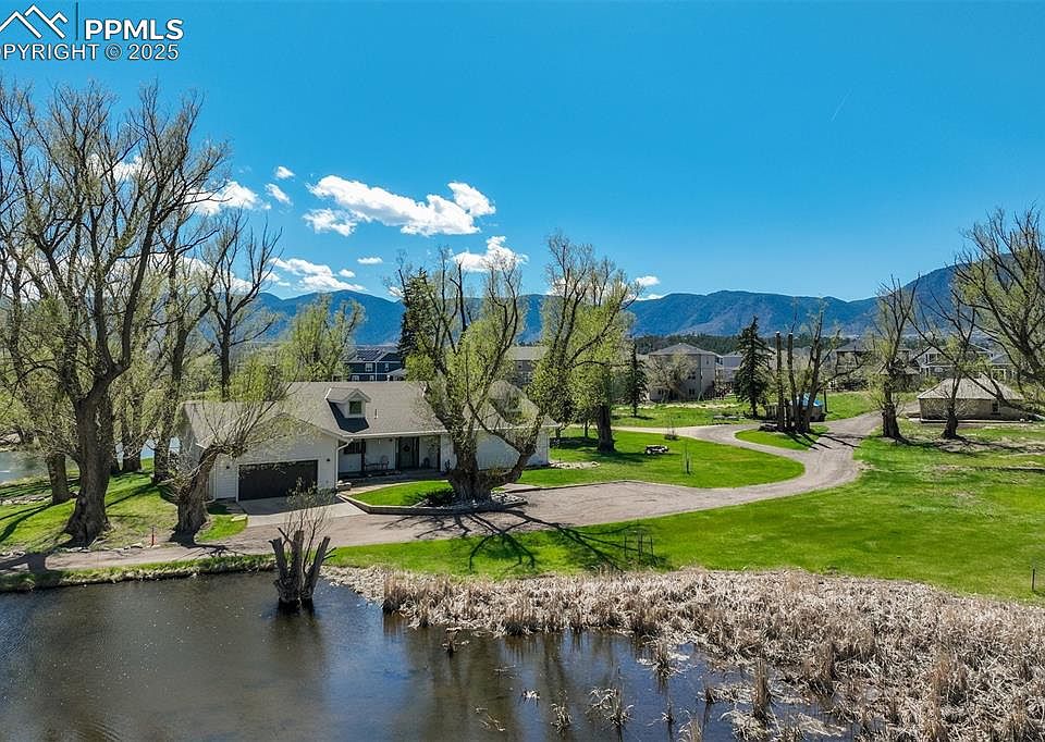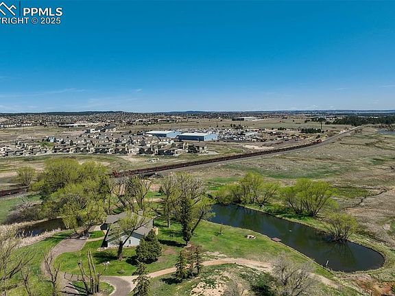 A Rare Blend of Charm, Comfort, and Colorado Beauty — Your Private Retreat of just under 10 acres IN TOWN awaits! Nestled on 9.65 pristine acres with private fishing ponds & scenic views, this extraordinary property offers a rare fusion of recreation, historic charm, and luxurious updates. Thoughtfully remodeled, the main home built in 1988 features a floor-to-ceiling river rock fireplace, hardwood floors, and tongue-and-groove ceiling w/vaulted beams. A wall of picture windows floods the wide-open living spaces w/natural light and showcases the surrounding landscape & mountain views. The gourmet kitchen is a true showstopper. It boasts rich two-tone cabinetry by Brooks Brothers, granite countertops, a 5-burner gas range, Thermador downdraft system, wall oven, pull-out pantry shelving, and an architectural dormer for added light. The generous casual dining area and multiple seating nooks are ideal for both relaxing and entertaining, enhanced by custom lighting and premium finishes. Retreat to a spacious master suite that opens to a private deck overlooking the property and pond. Enjoy a spa-inspired bath with a double vanity, a luxurious shower, and custom walk-in closet. Two additional bedrooms offer lovely views and share a Jack & Jill bath. A home office w/a Murphy bed and a main level laundry add everyday practicality and elegance. Outdoor living is just as impressive, w/a covered front porch and two rear decks—one sheltered under a tongue-and-groove roof—perfect for soaking in the serene environment. The surrounding landscape, riparian wildlife, and mountain views create your very own refuge. Multiple outbuildings including a historic blacksmith shop with carriage doors, an original homestead, chicken coop, and the "depot" with its own deck, ready for your vision. Located just minutes from I-25 and within the sought-after D38 school system, this one-of-a-kind property blends tranquility, function, and timeless appeal. Come home to your everyday vacation.