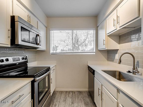 Apartment Community near Downtown Mesa! This 2 bedroom 1 bath unit has white cabinets, fun backsplash, with full stainless steel appliance set and quartz countertops. Plank wood flooring though out the home and in unit washer and dryer room with lots of storage space. Free parking in complex and storage closet.