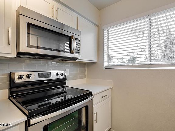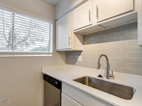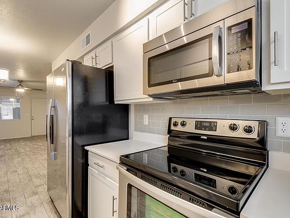 Apartment Community near Downtown Mesa! This 2 bedroom 1 bath unit has white cabinets, fun backsplash, with full stainless steel appliance set and quartz countertops. Plank wood flooring though out the home and in unit washer and dryer room with lots of storage space. Free parking in complex and storage closet.