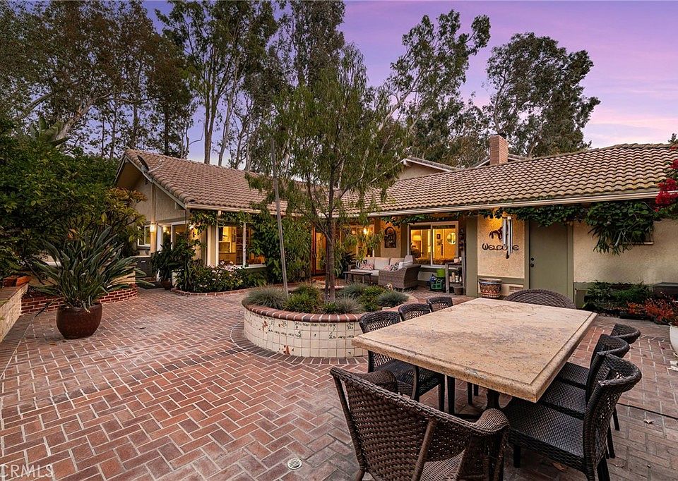 Welcome Home to Modern Living in the Heart of Orange Park Acres. Nestled within the private, gated equestrian community of The Wilderness, this remodeled home blends timeless craftsmanship with modern sophistication, creating a space that is both comfortable and refined. Step inside the large front courtyard, gated for privacy and seclusion—and enter through a custom double glass front door framed with gorgeous solid wood. Inside, you’ll discover new Milgard double-pane windows and large skylights that fill the home with natural light. All-new interior doors, casings, and moldings, while rich, wide-plank hardwood flooring flow throughout the living spaces. The formal dining room provides a setting for memorable gatherings, while the living room features art lighting and a fireplace with a wood mantle, creating a cozy atmosphere. Custom cabinetry and a built-in bookcase line the hallway, enhanced with quartz countertops that offer style and functionality. The chef-inspired kitchen seamlessly connects to the main living areas. The remodeled primary suite—complete with a large skylight and vaulted ceilings—offers a retreat with an expanded closet, dual-sink vanity, and a bathroom showcasing designer finishes, additional closet space, and high-end fixtures. Throughout the home, you’ll appreciate new lighting, custom window coverings, and details that define every space. Additional upgrades include a new furnace, water heater, and re-piping of the entire home, ensuring peace of mind. Vaulted ceilings and skylights create an airy, open ambiance, while the indoor-outdoor flow leads to a serene backyard oasis. The landscaped yard wraps around the home so you can enjoy al fresco dining outdoors, unwind by the built-in BBQ,watch the beautiful fish and Myrtle the Turtle in the pond, or relax on the expansive grassy area surrounded by mature trees and lush greenery. A spacious side yard offers even more room for outdoor enjoyment. The garage features built-in cabinetry for storage. As part of community, residents enjoy access to horse stables, riding arena and trails, and parking for RVs, trailers, and boats. This rare enclave offers tranquil country living—just moments from Peters Canyon, Irvine Regional and Santiago Oaks Park, and easy access to the 241/261 Toll Roads. Blending quality, comfort, and elegance, this extraordinary home invites you to experience Orange Park Acres living at its finest—a true sanctuary that must be seen to be appreciated.