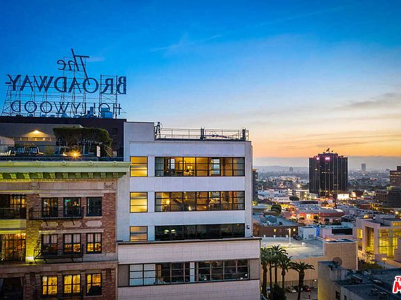 Iconic, landmark-building penthouse with dramatic views from two stories of glass looking out to the Hollywood sign, hills, and Capital Records. Fabulous live-work space with incredible volume, two deluxe marble bathrooms, and spacious, over-sized closets. The first-floor has a secondary bedroom area which is currently open, last used as a workspace but also has been used as a media room. An open kitchen ushers you to spectacular living area and staircase to PRIMARY ensuite bedroom-loft with outdoor terrace and fireplace. The fantastic rooftop pool area at The Broadway Hollywood is lined with cabanas and an adjacent gym. Terrific 24-hour staff and two parking spaces with 24-hour valet service. Katsuya Hollywood is downstairs, great farmers market on Sunday nearby, Trader Joes, The W Hotel, Pantages Theater, etc.