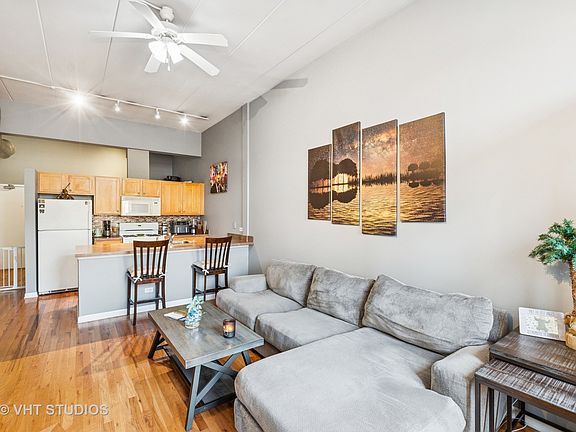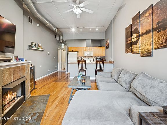 Welcome to 60657 Lofts, a premier loft community in Lakeview. This 1-bed + den home offers a spacious and bright floor plan with 11-foot ceilings, gas fireplace, hardwood floors, WIC with custom built-ins, private balcony, in-unit laundry, 6x5 storage, and garage parking space included in the price. This spacious kitchen has maple cabinets, plenty of storage, and a large island that is perfect for hosting family & friends. This floor plan offers an additional living space that can be a home office, den or easily enclosed and used as a guest room. The building boasts two common roof decks with stunning city views, grills, and a prep kitchen. You will love the location, just steps away from the Paulina Brown Line, Whole Foods, Target, Starbucks, and a variety of dining, shopping, and entertainment options that Roscoe Village & Southport Corridor have to offer. 60657 Lofts is a pet & investor friendly building, has low assessments and no upcoming specials. Don't miss this opportunity to own a piece of Lakeview's history and charm!