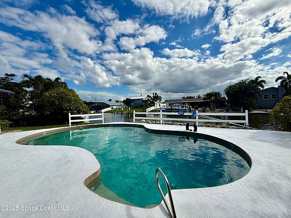 This waterfront pool home on Merritt Island boasts approximately 176 feet of frontage along a navigable deep-water canal featuring a spacious turnaround basin suitable for large vessels. With direct access to the Banana River and ocean via Port Canaveral, the property offers exceptional boating opportunities. Constructed from concrete block, the residence includes a four-bedroom split plan with two bathrooms, an inground pool, and all-tile flooring throughout. The bathrooms have been renovated, and the roof was replaced in 2016, with the HVAC system updated in 2017. Hurricane impact windows were installed in 2022, enhancing safety and energy efficiency. The open layout encompasses a kitchen, living room, family room, and a 35x13 Florida room complete with a fireplace, which provides access to a bathroom and features large sliding doors leading to the pool and waterfront. The expansive lot is surrounded by a privacy fence, mature landscaping and shade trees,