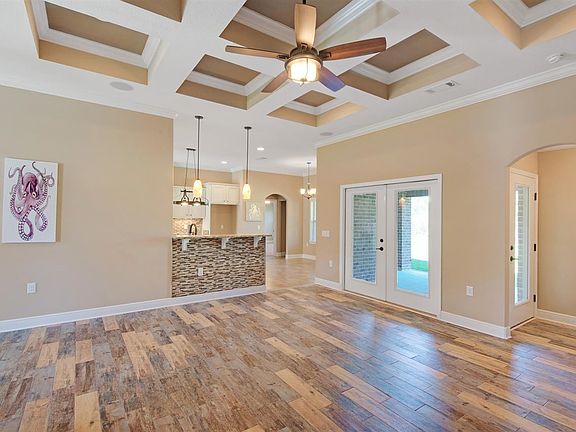 *Note, Photos are from model of this home. 2800 square foot 4 Bedroom, 3 Bath, 2 car garage, Craftsman style ranch Brick/Hardboard Home. This home features wood look plank ceramic tile in kitchen, foyer, dining room, great room, master bath, guest bath and 2nd master suite bath. Custom 5 1/4'' trimmed baseboards throughout. Two staged Crown molding in Master bedroom, Great room, den/office with french doors, dining room. and foyer, Kitchen has custom staggered cabinets with crown molding, under cabinet lighting, quality granite tops, tile back splash, large island that opens from two-sides, and has a built-in desk in kitchen. Exterior of the home has irrigation and sprinkler system included. Oversized Garage has exterior utility door to side for convenient access, pull down attic stairs, and is painted and trimmed with a garage door opener. All bedrooms have ceiling fans and easy access double doors to closets. Master bedroom location is private split design and it features, vaulted ceiling, crown molding, corner can-lights. Master bath is large with 2 separate sinks large his and hers vanities, large linen closet, private water closet with door, a window, large tub, ceramic tile shower with seamless shower doors, 18" tile floors. Large covered front porch with 2 ceiling fans and rear porch with ceiling fan. The Interior features knock down ceilings, bull nosed corners in common areas, and rocker switches, Double 10 lite wood French doors to the study. Quality Oil rubbed bronze fixtures,upgraded pendants over breakfast bar, 2 large lanterns over island and wood bead chandelier over kitchen table. Custome bookshelves between kitchen & Master bedroom. Highly efficient energy 14 SEER Heat Pump. Earth Cents Energy Saving design, New High quality home, with many extras.storm shades included. Amazing features to include underground utilities, low E vinyl windows, granite in all baths, Whirlpool Gold appliances and a built in mud room. Home is also pre wired for a security system and surround sound. covered back porch area, with large additional patio inside screen room with 2021 high quality hot tub. additional paver stone patio outside screen room. Gutters. White wood shutters on windows throughout.