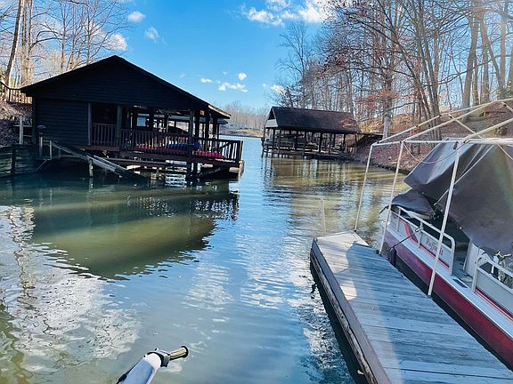 Enjoy an affordable lakefront home with low maintenance brick siding. This lake home has approx 1,920 finished sq. ft on the main level and 1,260 sq. ft unfinished on the lower level. 3 Bedrooms, 2 Full Baths, Living Room with real masonry gas Fireplace. Additional Fireplace on lower level. New metal roof approx. 4 years old, Window sills are marble. Kitchen with hickory cabinets. Stainless Steel Refrigerator approx 1 year old . Tinted windows. Deck has composite decking. This home has an open slip that adjoins two other docks with the neighbor. Paved circular driveway. There is a driveway on the right side of the home that you can drive to the dock