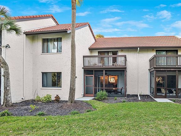 Bathed in natural light and surrounded by lush greenery, this turnkey-furnished two-bedroom, one-and-a-half bath townhouse offers a rare and refined living experience within Castel Del Mare. With 1,036 square feet under air and 1,232 total square feet, the residence is distinguished by two private outdoor retreats—a covered, screened ground-level lanai and an open second-floor balcony, a coveted design found in only eight homes in the entire community. Southern exposure enhances sunlight, privacy, and tranquil greenbelt views from both levels. The entry welcomes you with a beautifully remodeled half bath and an interior utility closet with a stacked washer and dryer—an uncommon feature in this complex. Thoughtful storage continues beneath the staircase, where a generous under-stair storage area houses the newer HVAC system (2020) and hot water heater (2017). The kitchen has been tastefully updated and had new stainless steel appliances installed in 2022. The living and dining area flows seamlessly to the screened lanai, where serene views of mature trees and open green space create a peaceful, private setting. Tile flooring throughout the first level adds both elegance and easy maintenance. Upstairs, the carpeted split-bedroom layout provides comfort and privacy. The primary suite is quietly positioned at the rear and opens onto its own private balcony—perfect for morning coffee or evening breezes among the treetops. Both bedrooms feature walk-in closets, along with a hall linen closet and a locked owner’s closet within the primary suite. The primary bath includes dual-sink vanity and cabinetry updated in 2022. Assigned parking is located directly in front of the residence, with ample guest parking nearby. Castel Del Mare offers a true resort-style setting, with recent community-wide enhancements including refreshed landscaping, irrigation, pavers, and two newly renovated swimming pools. Additional amenities include tennis and pickleball courts, shuffleboard, a gazebo, fishing pier, natural gas grilling areas, and complimentary bike and kayak storage. Enjoy a 10-minute walk to world-famous Siesta Key Beach, consistently ranked among the best beaches in the world, as well as numerous nearby restaurants and shops—making this an exceptional location for both relaxation and convenience. The monthly HOA fee covers exterior building and roof maintenance, landscaping, recreational amenities, on-site management, strong reserves, basic cable, water, sewer, trash, recycling, and weekly pest control. Ideal as a primary residence, seasonal retreat, or investment opportunity, this home delivers privacy, comfort, and an unbeatable Siesta Key lifestyle just minutes from everything that makes Sarasota so desirable.