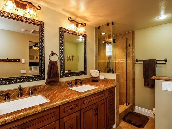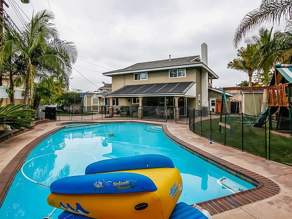 This Gorgeous 4 Bedroom, 3 Bathroom TURNKEY Home is situated on HUGE 8,400 sq ft Lot with Beautiful Hardscape and Newer Lush Landscaping! This Home is Remodeled from Top to Bottom: Kitchen has Newer Stainless Steel Appliances, Rich Cabinetry, Granite Countertops, New Windows Thru-Out with plantation shutters, Lutron Lighting system and recessed lighting throughout. Rich Hardwood and Travertine Flooring, PLUS hardwood floors in the Family Room, Stairwell, Upstairs Hallway, and crown molding throughout! Upstairs master bathroom and powder room have been updated. Rich, Harmonious use of Designer Materials and Color Schemes Thru-out. The Oversized Backyard is a Retreat with Sparkling Pool, Spa and outdoor shower! Backyard also has Expansive Grassy Area, Custom Lighting in Stone Planters, AND Professional Covered Patio for Indoor/Outdoor Entertaining! Newer Sheds worth $1000s, plus MANY Electrical Upgrades, including security system with 4 cameras and video monitoring, and a New Driveway, Recently Expanded for More Parking! Newer Solar Pool Heater, and some Recently Upgraded Pool Equipment. This Home offers so MANY Upgrades...too many to List! Great Location Near Award-Winning Schools and the Beach!