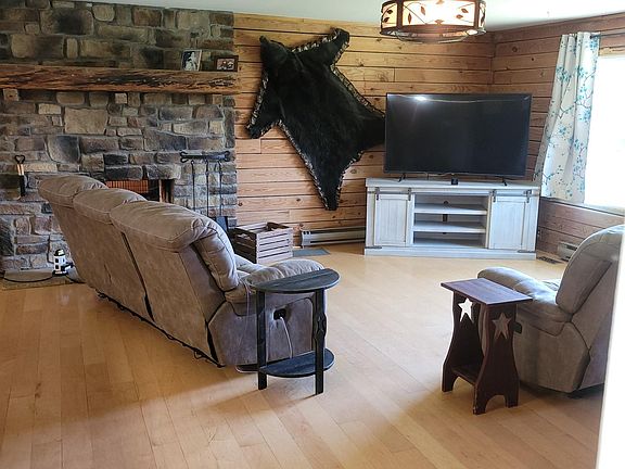 This 3 bedroom, 2 full bath log home on nearly 70 acres is a hunter's paradise! You'll be surrounded by mostly wooded land with open fields and glades, trails, a picnic and camping area with fire pit, and a private pond. Bring all the toys, pets, and animals, this place has plenty of room to house and store them all and plenty of room to run, ride or hike! The property includes a 30'x50' pole barn that has been set up to be used as a hunting lodge, man-cave, or guest house. The pole barn includes a full kitchen area, full bathroom, separate living/sleeping area, and a 6'X8' walk-in commercial cooler. The main home features an open concept kitchen/family room combination with a formal dining room. A large double sided-ed stone fireplace opens between the family room and dining room. The master bedroom with ensuite bath opens to a large 18'X18' sunroom which leads to a large exterior deck. Downstairs you'll find a full-size open unfinished basement with entertainment bar area, laundry room, a large clothes storage closet, and all the additional storage space you'll need. The home had a new metal roof installed in 2017, new windows and garage doors in 2020, and a new dishwasher, fridge, and stove in 2022. The property includes 3 parcels on 3 tax records. See records in Documents Section. Currently registed in the Forestry Program which helps with reduced property taxes. Sold "As Is". Be sure to call to schedule your private tour right away, this unique home is sure to go fast!