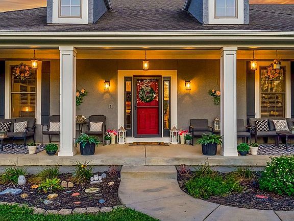 Step inside to an open floor plan with 9- and 10-foot ceilings and exquisite finishes throughout. The kitchen is a chef’s dream, featuring granite countertops, custom cabinetry, stainless steel appliances, a walk in pantry, a large angled island with sink & dishwasher, and soft-close drawers. This space is perfect for family gatherings and entertaining guests, who will admire the beautiful fireplace in the hearth room. A traditional office with French doors is conveniently located off the living room. The full, walkout basement includes a large living room, 3 large bedrooms, 2 full baths, an additional non-conforming bedroom, a nook, & a large storage area and storm shelter, offering ample space for various uses. Step outside to the oversized fenced backyard and relax in the shade under the deck. The patio includes a 220 hookup perfect for a hot tub.