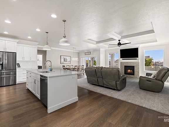 This home has an open floor plan. It has a split bedroom floor plan. It has a huge pantry. In the living room has electrical outlets on floor for those sofa recliners. It has a 3-car garage with epoxy flooring and comes with custom shelving. Has a sterling water softener. It has an extended patio out back which includes a gas hook up. It also has an electrical outlet for hot tub. The home is located at walking distance to the Middleton high school.