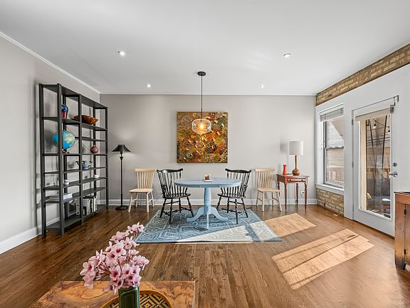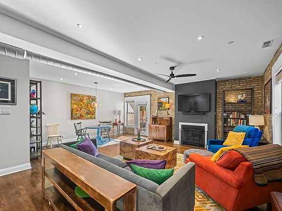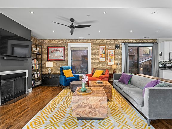 Sprawling 3BD/2.5BA duplex-down loft with exposed brick, perfectly positioned between the heart of Southport Corridor and Roscoe Village. The main level offers a completely open floor plan with dedicated living and dining areas, two large outdoor spaces, and refinished hardwood floors. The spacious kitchen features white cabinetry, stainless steel appliances, black granite counters, and a breakfast bar that opens seamlessly into the living room and the balcony (the first of two outdoor spaces!). A conveniently placed half bath sits just across the way. The living room area features a cozy fireplace while the separate dining area flows naturally into the rest of the home, creating an ideal setup for entertaining or everyday comfort. From here, step out to the larger covered deck, complete with a custom-built sectional that the owners are happy to leave for the next buyer. Downstairs, you'll find all three bedrooms, two full bathrooms, and in-unit laundry. The primary suite offers a generous walk-in closet and a full en-suite bath. The unit also comes with two exterior deeded parking spaces, a private storage cage, and bike storage. Many significant upgrades have already been done, including new LG microwave (2024), new stacked electric ventless Bosch washer/dryer (2021), new breaker panel (2021), new carpet (2021), new furnace (2019), and so much more. Set in a professionally managed courtyard building, this unit sits quietly toward the back, providing peace and privacy away from the bustle of Addison Street.