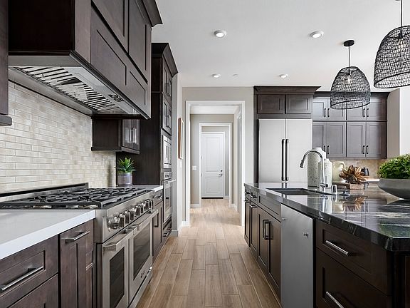 Plan 2 at Vistas at Mockingbird Canyon features 5 bedrooms, 4.5 bathrooms, and flex room with an optional tech desk, perfect for telecommuting. On weekends, you'll play the role of effortless host, from whipping up a five-star meal in your state-of-the-art kitchen, chatting over drinks across your spacious kitchen island or open-concept great room to enjoying an alfresco meal in your stylish covered outdoor living space. Enjoy elevated touches throughout the home, such as a butler's pantry, secondary suite on the main floor, a mud room/hobby room, lounge area on the second floor, and much more.