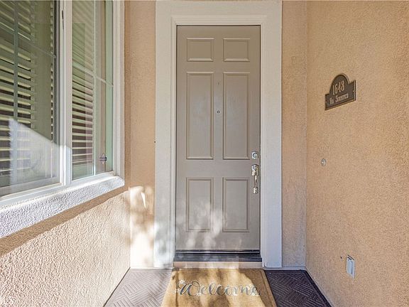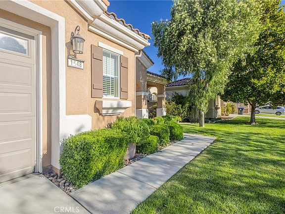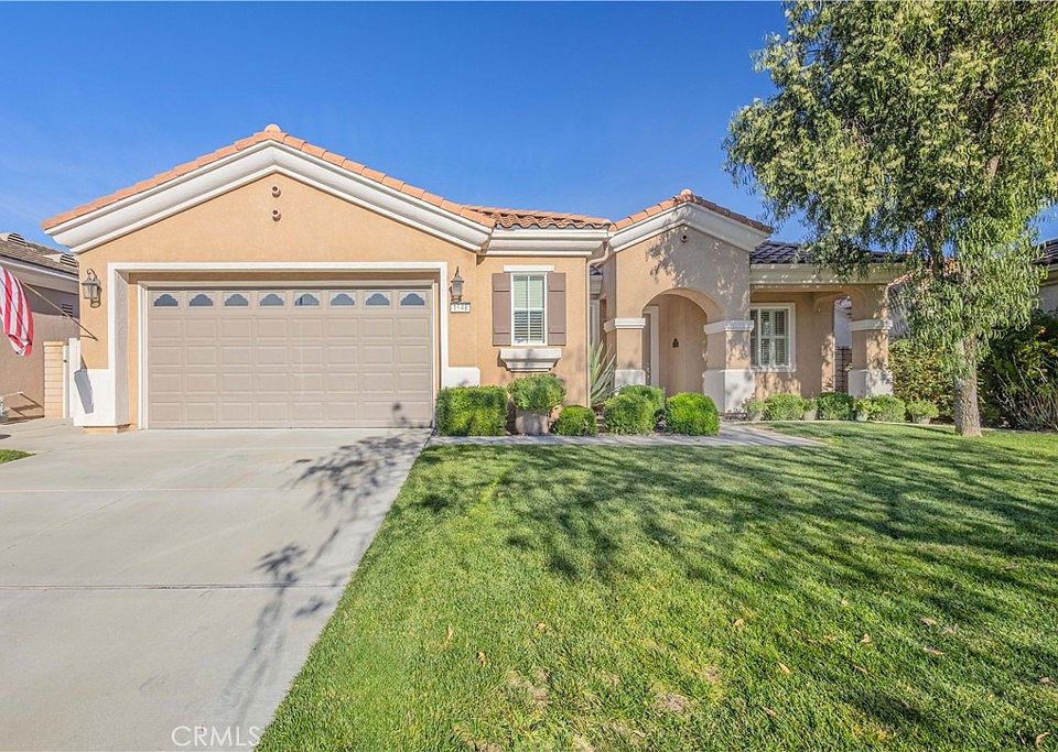 Welcome to this beautifully upgraded home located in the highly desirable 55+ community of Solera Diamond Valley by Del Webb. Thoughtfully enhanced from top to bottom, this spacious & versatile popular "El Dorado" floor plan offers 2 bedrooms (each on opposite sides of the home) 2.5 bathrooms, formal dining room & a generous bonus room that can be used as a den, hobby room, exercise space, or optional 3rd bedroom. From the moment you enter, you'll notice the attention to detail with crown molding throughout, custom plantation shutters, upgraded paint, & ceiling fans in nearly every room, including the patio. The open-concept kitchen flows seamlessly into the family room & features stainless steel appliances, a center island with breakfast bar, Corian countertops, recessed lighting, upgraded cabinetry, with pull-out shelving, & newer sink. The primary primary suite is a true retreat, offering a large walk-in closet with custom shelving & a spa-inspired bath complete with an oversized soaking tub, separate step-in shower featuring a custom teakwood shower mat, & dual vanities. The half bath has been tastefully updated with bead board accents & a Pottery Barn mirror. The laundry room includes upper & lower cabinetry, utility sink, & decorative stainless shelving. Step outside through oversized sliding doors to a peaceful & meticulously designed backyard oasis, complete with a private Caldera spa which includes pump, filter, ozone system, & heater. Enjoy year-round relaxation under the extended alumawood patio cover with ceiling fan or gather around the freestanding outdoor fireplace with chimney. Custom concrete, river rock, stepping stones, fountain, raised planters, fruit trees, solar lighting, perimeter water faucets, block walls & vinyl fencing create a serene & functional outdoor living space. The garage is equally impressive with epoxy flooring, Gladiator cabinets, rail systems with hooks, Rubbermaid mounting bars, pegboard, upgraded lighting, workbench with solid wood top, replaced garage door opener, newer gas water heater & replaced pressure regulator. Residents enjoy resort-style amenities including indoor & outdoor pools, spa, a workout fitness center that includes an indoor walking track, library, billiard tables, conference rooms, bocce ball courts, pickleball courts & tennis courts. The community has daily, monthly & annual events that bring the community together! This exceptional home offers comfort, quality, & lifestyle; truly a must-see!