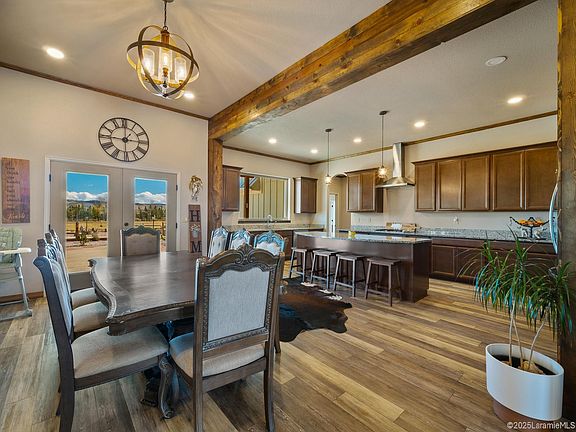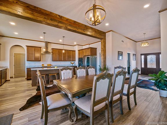 Welcome to 1648 Cavalry Row — a stunning modern home set on 6.63 acres in the desirable Paddocks community just minutes south of Laramie. Built in 2020, this spacious 5-bedroom, 3.5-bath home offers nearly 3,000 square feet of beautifully designed living space that combines contemporary comfort with wide-open Wyoming views. The open-concept floor plan features soaring ceilings, a warm and inviting living area centered around a wood-burning fireplace, and large windows that fill the home with natural light. The kitchen offers ample cabinetry, granite countertops, and a seamless flow into the dining area, creating an ideal space for everyday living and entertaining alike. The primary suite is thoughtfully designed with dual vanities, a jetted soaking tub, and a walk-through closet that connects conveniently to the laundry room. On the opposite wing, two additional bedrooms and a full bath provide privacy for family or guests, while the upstairs bonus room with its own bath adds flexibility — perfect for a home office, guest suite, or playroom. Outside, the property offers endless opportunities to enjoy Wyoming’s natural beauty, with open space, a covered patio, and a fenced area ideal for pets, gardening, or simply relaxing and taking in the views. The 6.63-acre lot offers both privacy and proximity — located just a short drive to downtown Laramie and within easy reach of Fort Collins. Whether you’re seeking peaceful surroundings, room to roam, or a modern home with thoughtful design, 1648 Cavalry Row offers it all. Schedule your private showing today to experience the best of Wyoming living.