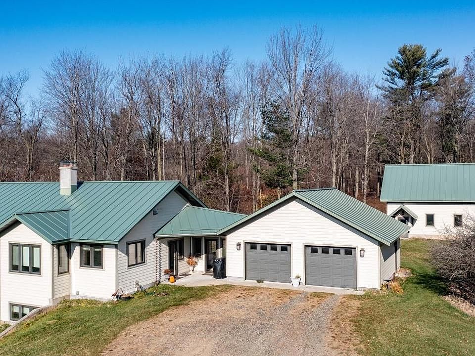 Get away from the city and enjoy country living. You will fall in love the moment you pull into the driveway and see this ranch home nicely tucked in the trees over looking the large yard and farm fields. This south facing home has been extensively designed for energy efficiency. Solar in-floor heat with boiler back up, wood burning fireplace, concrete hardboard siding and metal roof. First floor has large master suite with double closets, spacious living room with excellent views and large kitchen with plenty of counter top space. Walkout lower level has a 2nd living room, two large bedrooms, full bathroom, root cellar and large utility room. plenty of garage space with the 28x28 attached garage and the detached 24x36 garage. Plenty of wildlife roaming the 11 acres.